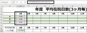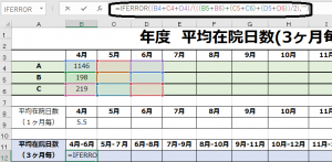 関数のIFERRORを使って、3ヶ月毎の平均在院日数の計算式を求めます。計算式入力終えたら右へドラッグします。(5月~3月まで)