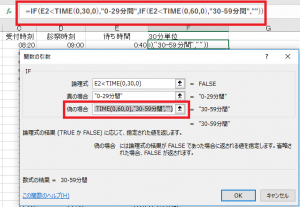 =IF(E2<TIME(0,30,0),"0-29分間",IF(E2<TIME(0,60,0),"30-59分間",IF(E2<TIME(1,30,0),"1時間-1時間29分",IF(E2<TIME(2,0,0),"1時間30分-1時間59分",""))))