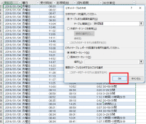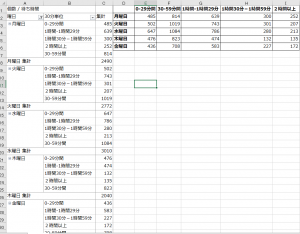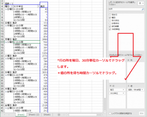 これで、曜日、30分間単位の集計が簡単に出来ました。ピボットテーブルって優れものですね!